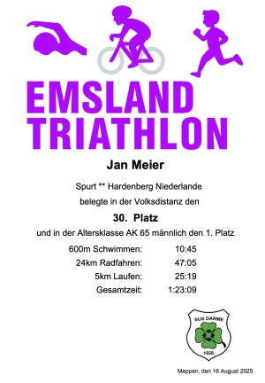 Hij heeft daarbij de Sprint-triathlon in een mooie tijd volbracht! Een Sprint-triathlon bestaat uit 600m zwemmen, 25km fietsen en je sluit je prestatie af met 5km hardlopen. De organisatie was in handen van de triathlonvereniging Susdarme. Het zwemmen vond plaats in het mooie meer van Meppen, de Möllersee. De fietsroute bestaat uit 3 x een ronde fietsen over de Panzerstrasse. De finish wordt bereikt na 5km lopen rondom de Möllersee. Jan werd 1e in zijn leeftijdscategorie met een tijd van 1:23:09!